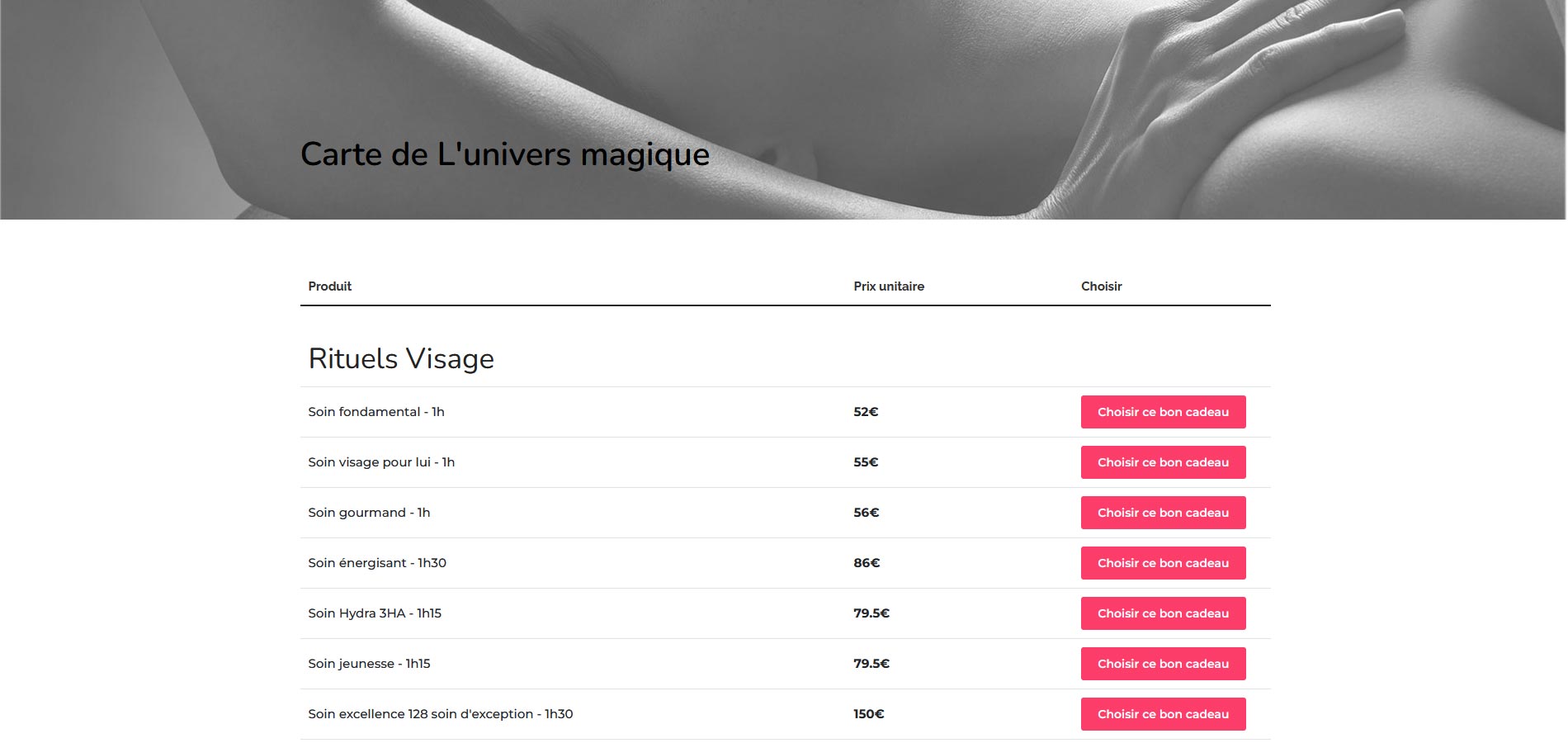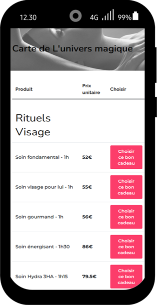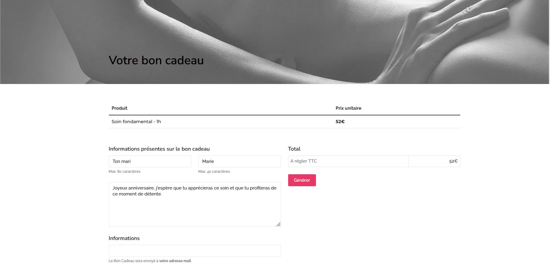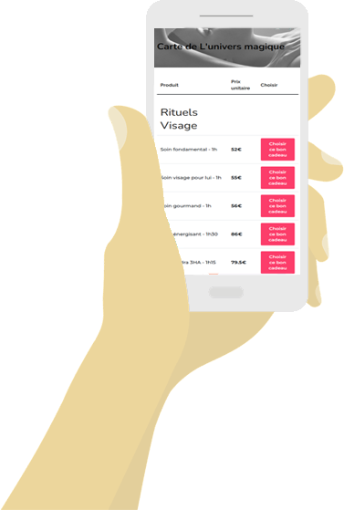 Votre client choisit parmi votre liste de services ou un bon cadeau en valeur. Après paiement en ligne, il reçoit par mail le bon cadeau à offrir.